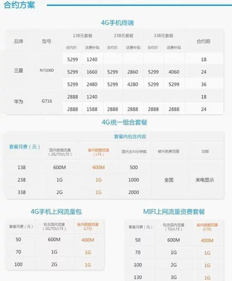 4G资费方面,分为三大类。一类是组合套餐,分为三档,分别是138元、238元、338元每月,包含流量分别是600、1G、2G流量,国内主叫通话500分钟、1000分钟、2000分钟。